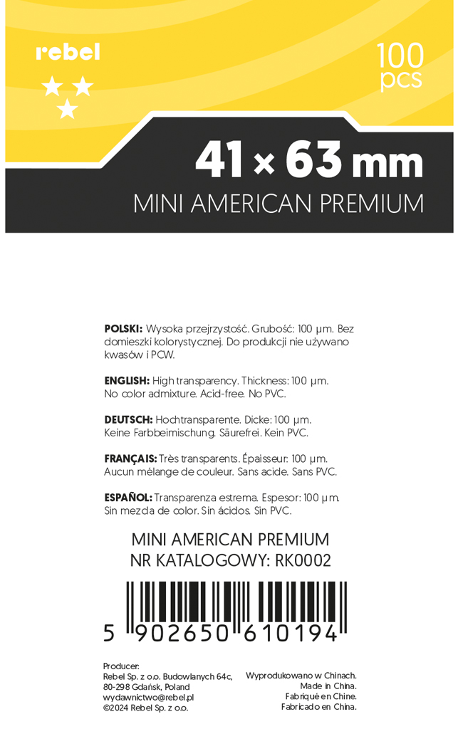 Opakowanie zawiera 100 koszulek na karty o rozmiarze 41x63 mm o podwójnej grubości.