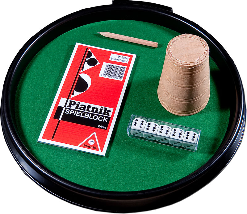 Efektowny zestaw do gry w kości oczkowe składający się z tacki, kubka, ołówka, bloczka do zapisu i 5 kostek. Dołączona instrukcja w języku polskim.