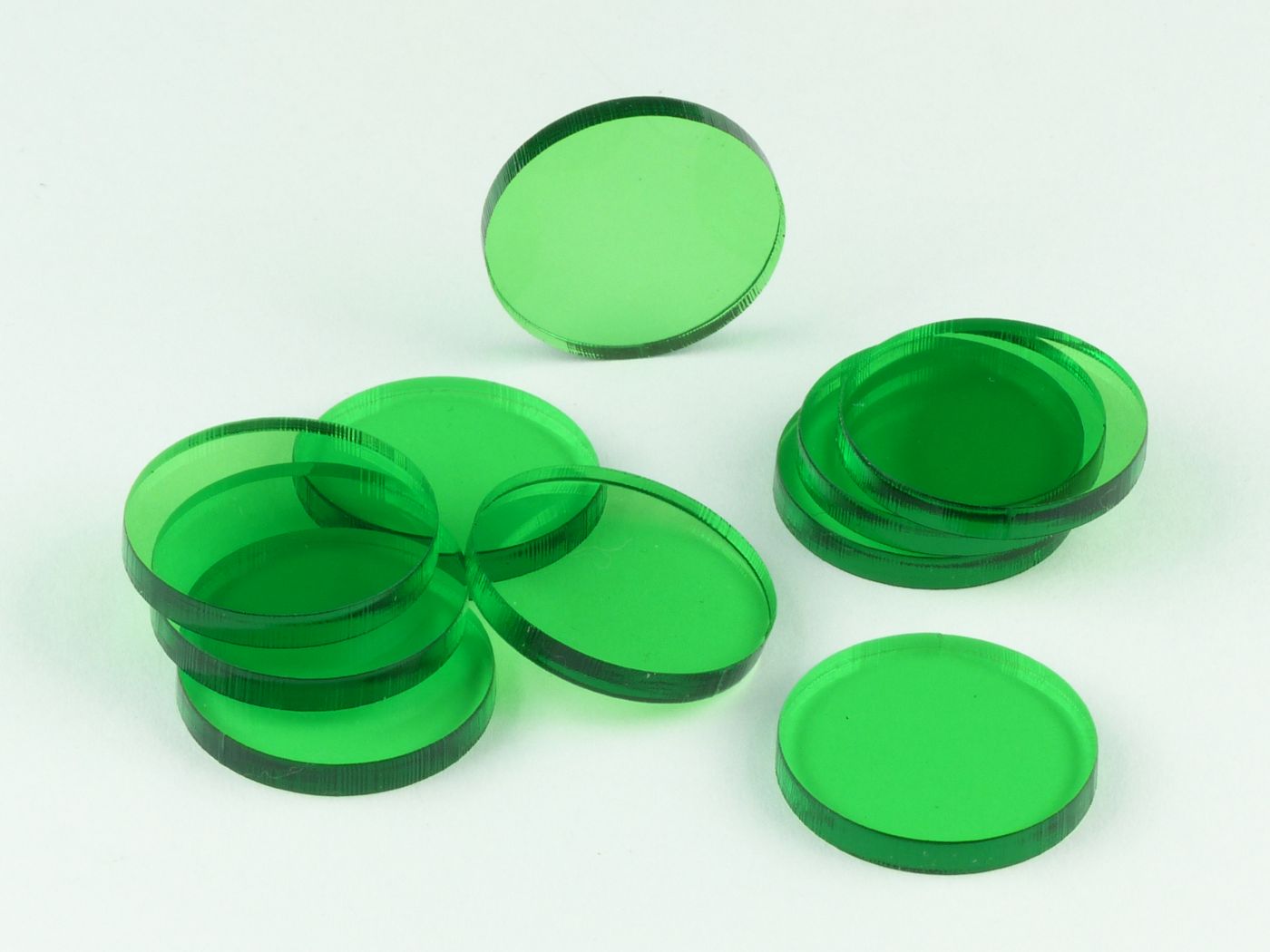 Zestaw 10 żetonów o średnicy 22 mm, wykonanych ze szkła akrylowego o grubości 3 mm.