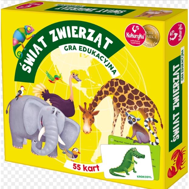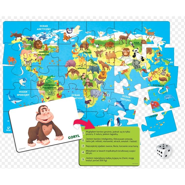 Świat zwierząt to gra w której uczestnicy muszą wykazać się wiedzą o tematyce przyrodniczej. Oprócz odpowiedzi na zagadki, gracze mają do złożenia bajecznie kolorowe puzzle, które tworzą mapę świata ze zwierzątkami.