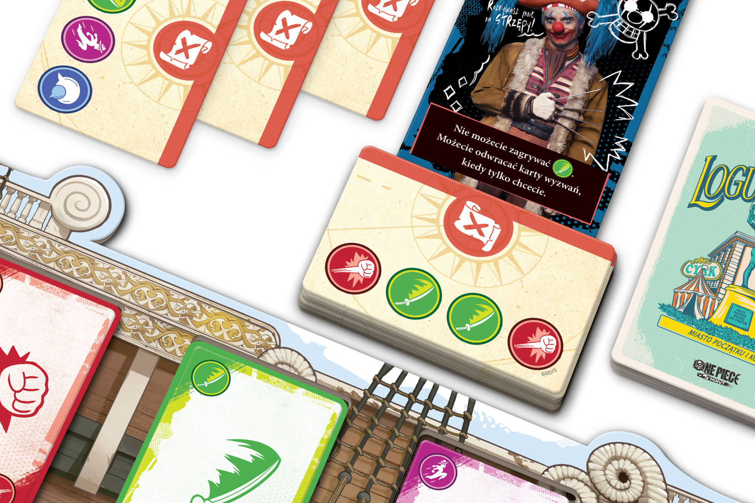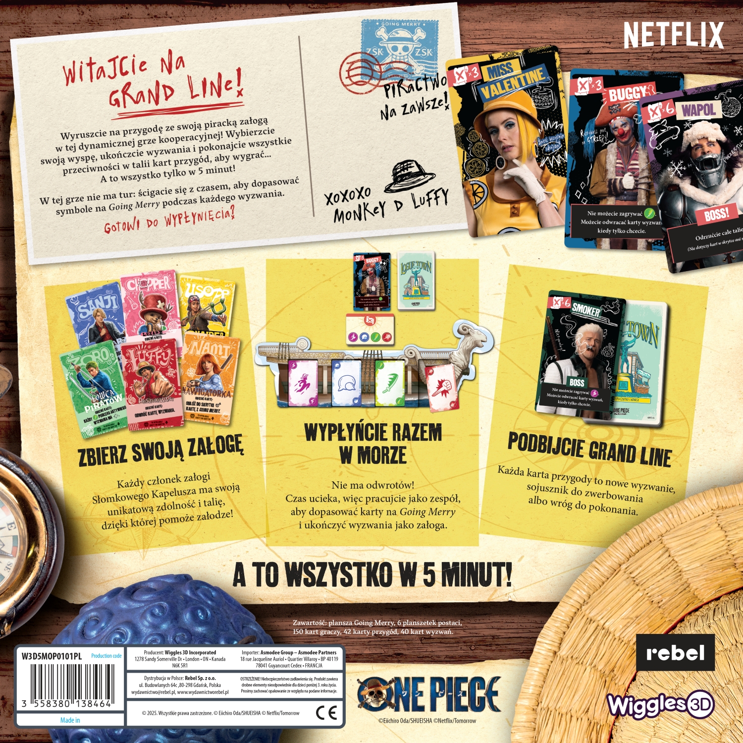 One Piece w 5 minut to dynamiczna gra karciana, w której współpracujemy, by ukończyć specjalną talię przygód zanim skończy się czas. Każda kolejna karta może kryć wyzwanie do pokonania – aby tego dokonać, będziemy musieli sprytnie zagrywać karty, by zebrać zestawy odpowiednich symboli. Nie ma odwrotów! Czas ucieka, więc pracujcie jako zespół, aby dopasować karty i ukończyć wyzwania jako załoga.