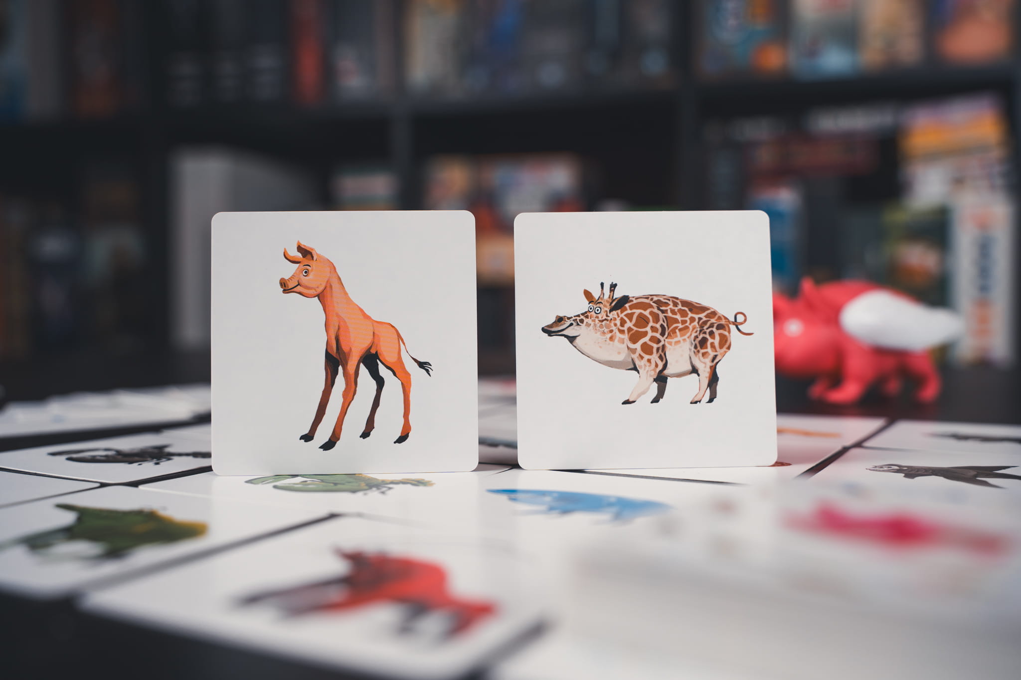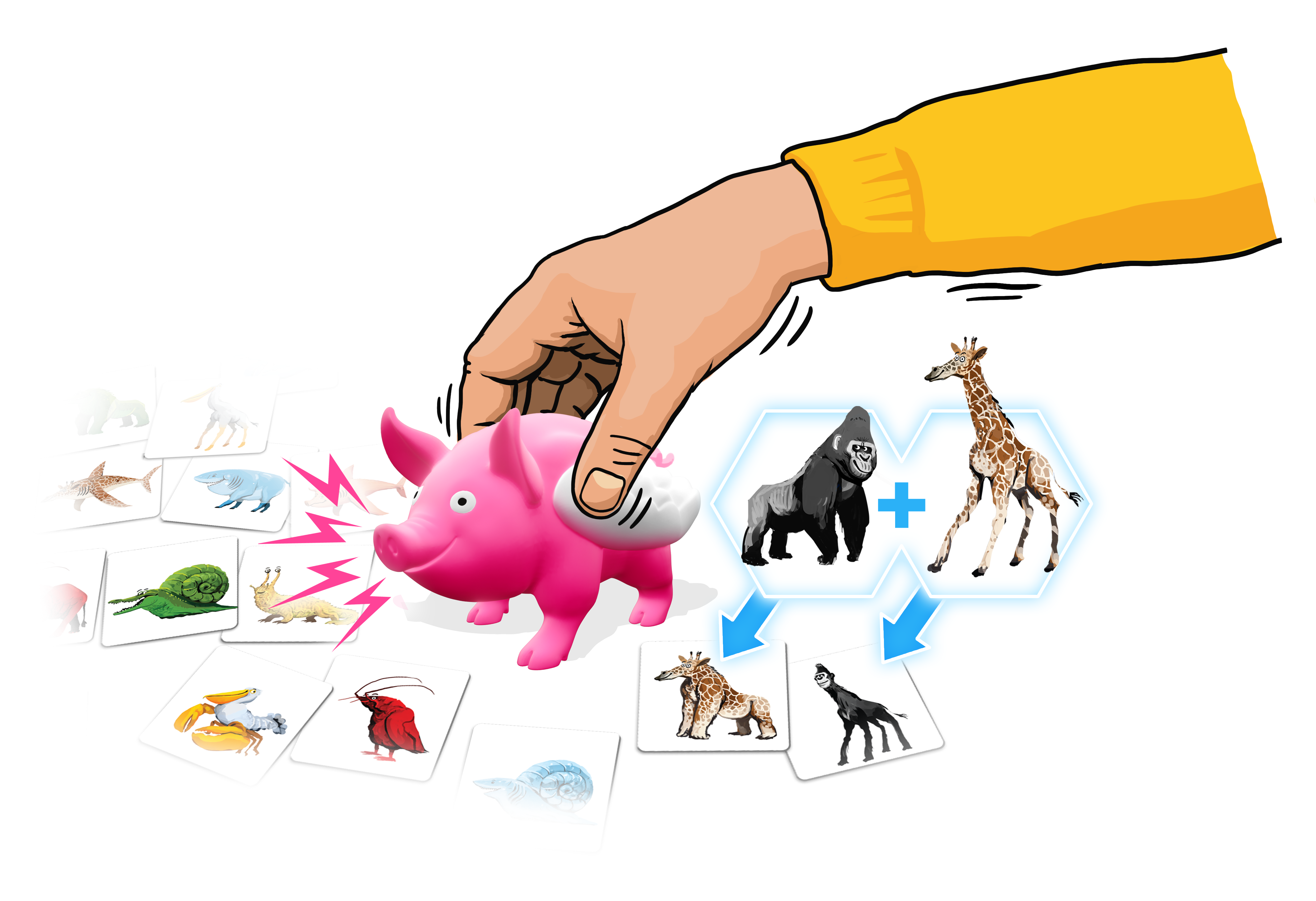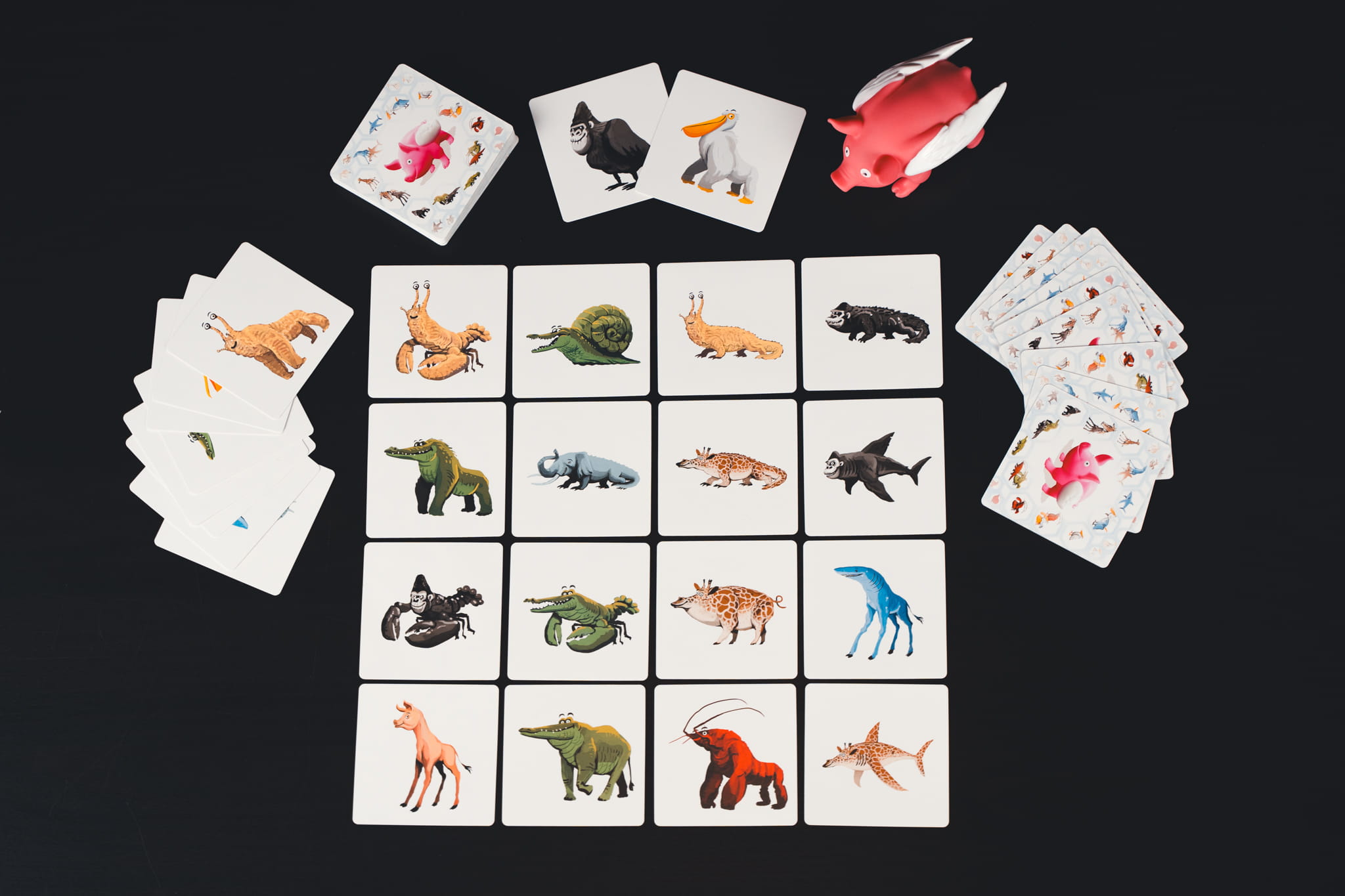 W tej dynamicznej grze liczy się szybka reakcja! Gracze muszą znaleźć pary kart, na których widnieją zabawnie pomieszane zwierzęta. Wygrywa ten, kto zbierze ich najwięcej. Ale uwaga – trudno powstrzymać śmiech na widok tych niezwykłych stworzeń! Skup się, miej bystre oko i zbierz jak najwięcej par, nie dając się rozbawić dziwacznym kombinacjom zwierząt!