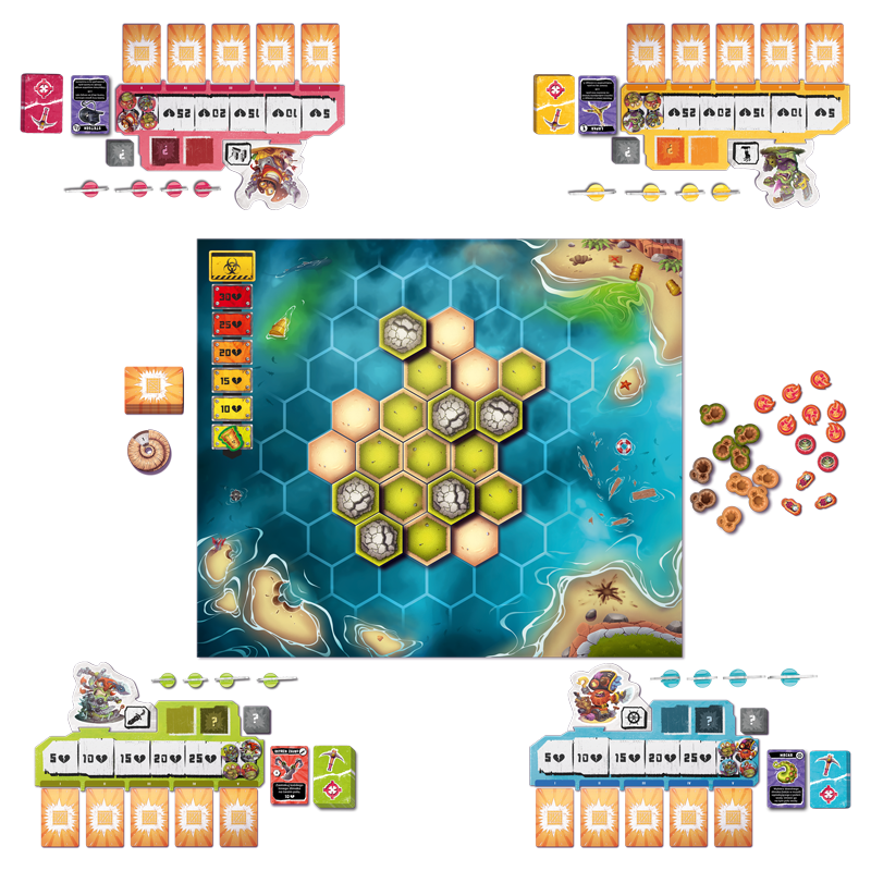 Instrukcja • 1 dwustronna plansza • 2 kości ataku • 1 licznik rund / znacznik 1. gracza • 4 arkusze pomocy • 4 planszetki graczy • 6 kafelków frakcji • 41 dwustronnych kafelków terenu • 18 znaczników ślimaków • 16 plastikowych podstawek • 110 kart akcji • 18 żetonów życia • 18 żetonów deklaracji • 3 żetony dynamitu • 8 żetonów ognia • 2 żetony min • 10 żetonów uszkodzenia terenu • 1 znacznik