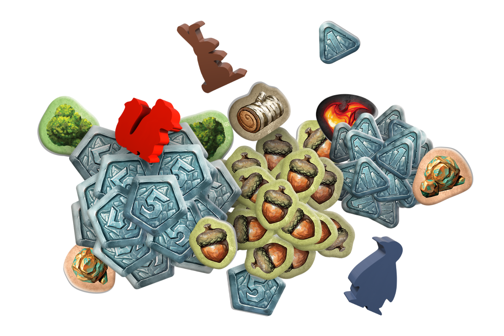 różne dodatkowe żetony (śnieg, ogień, konary brzozy, kępki mchu, grudki miedzi, żołędzie, punkty, żetony Łapy)